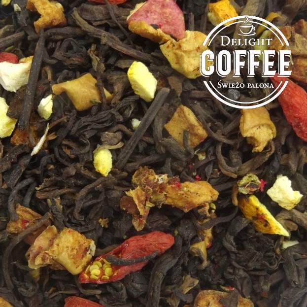 - Skład: herbata pu-erh, jabłko, goji, pomarańcza liofilizowana, chili, kwiat granatu, aromat