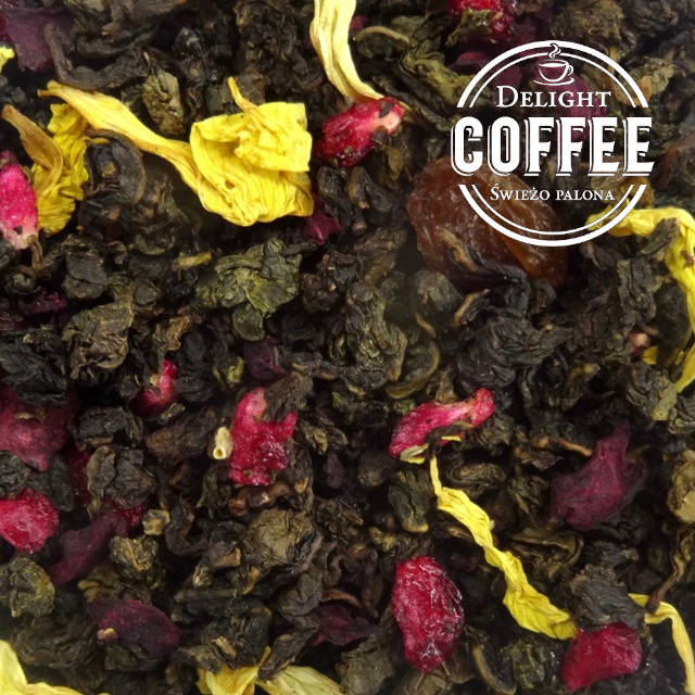 - Skład: herbata oolong palony, rodzynki, granat liofilizowany, burak, kwiat słonecznika, aromat